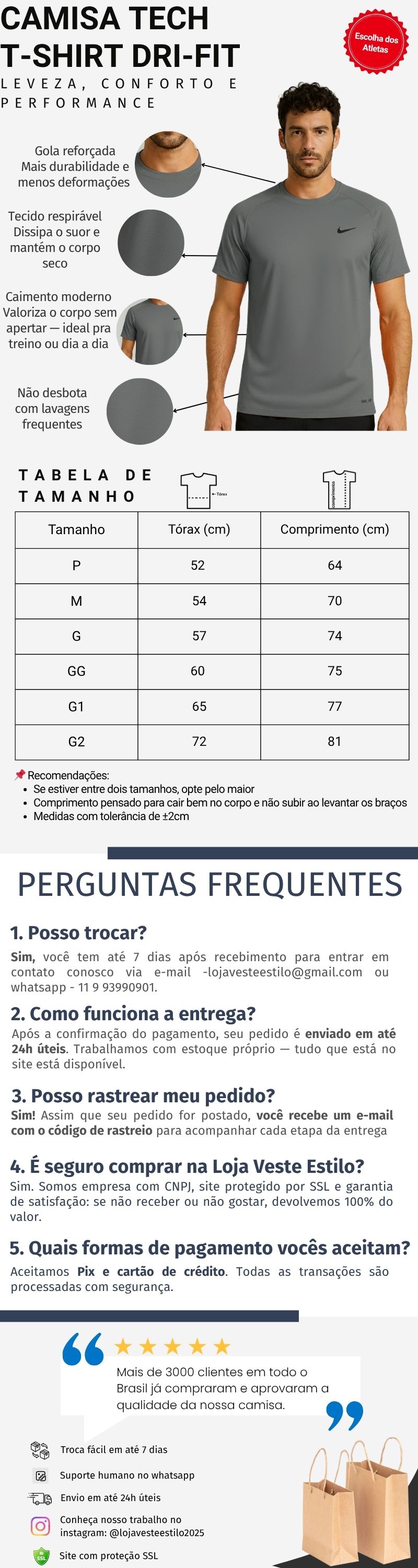 Camisa Tech T-Shirt Dri Fit Cinza. Tecido leve e respirável, ideal para treinos e uso diário.