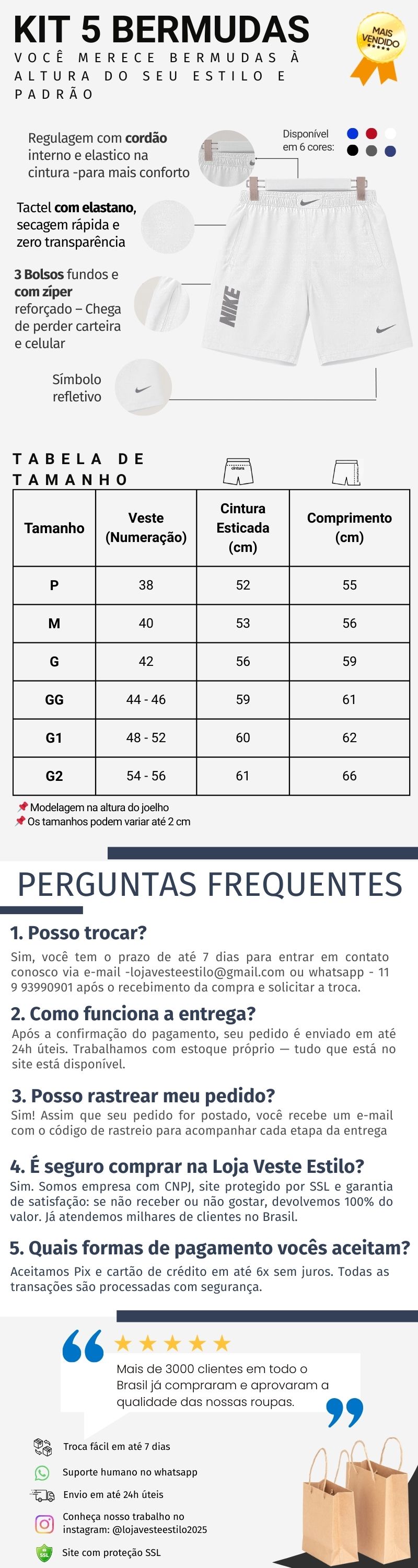 Kit com 5 bermudas masculinas com elastano do P ao G2 Plus Size, 3 bolsos com zíper e ajuste na cintura. Leves e versáteis — pra usar na academia, no dia a dia ou no fim de semana com conforto.